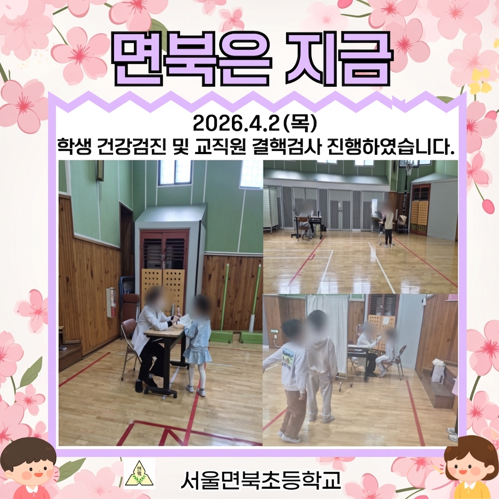 서울면북초등학교(교장 이경희)에서는 26.4.2(목)에 전교생과 교직원을 대상으로 건강검진과 결핵검사를 안전하게 실시했습니다. 학생들의 건강한 성장과 안전한 교육 환경 조성을 위한 이번 검사는 교직원과 의료진의 따뜻한 협력 속에 철저한 방역 수칙을 준수하며 원활하게 마무리되었습니다. 서울면북초등학교는 앞으로도 학생들의 건강과 안전을 최우선으로 생각하는 교육 환경을 만들어 나갈 것입니다.