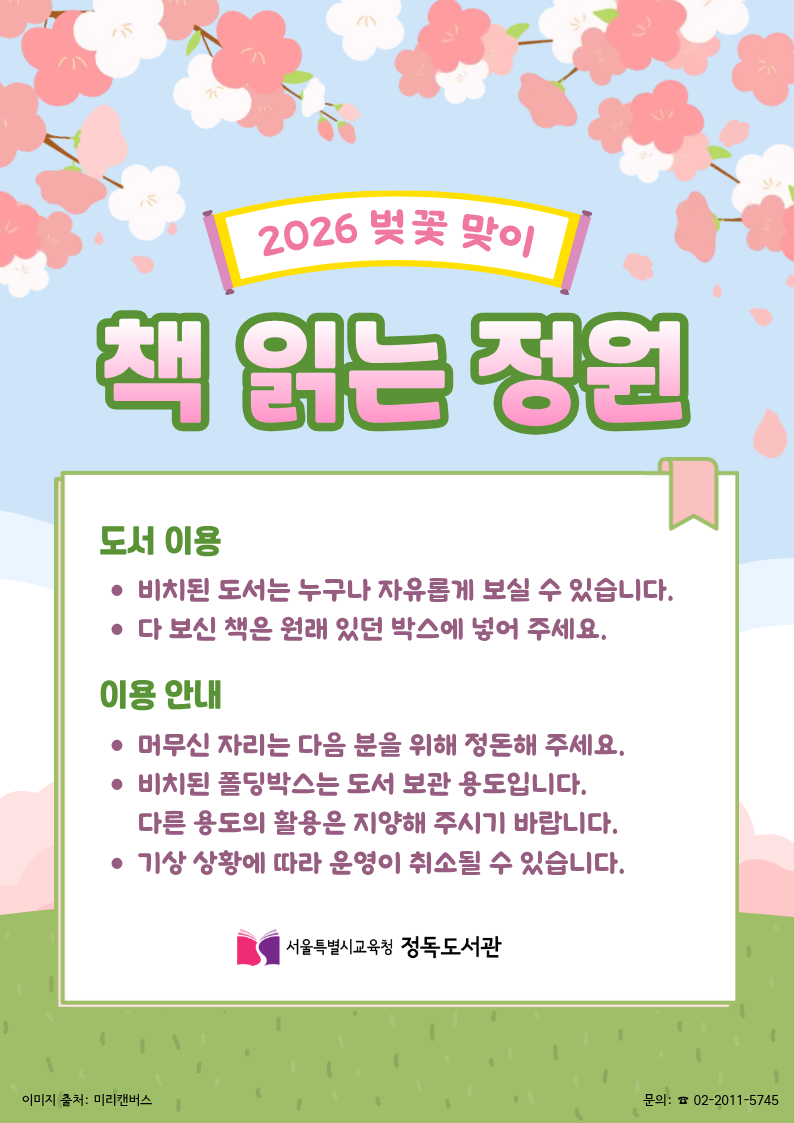 ▢ 서울특별시교육청 정독도서관(관장 엄동환)은 3월 25일부터 도서관 내 야외 정원에서 2026 벚꽃 맞이 「책 읽는 정원: 모두의 도서관」을 운영한다.
