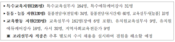 ▢ 이번 정기 채용은 총 10개 직종을 대상으로 하며, 특히 특수교육 및 돌봄·늘봄 지원 등 현장 밀착형 교육 지원 인력이 강화된 것이 특징이다.