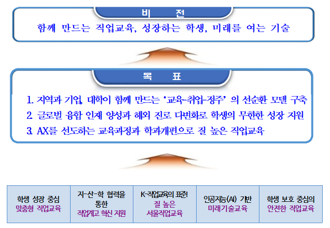 ▢ 이번 종합계획은‘함께 만드는 직업교육’,‘성장하는 학생’, ‘미래를 여는 기술’을 비전으로 5개의 중점과제를 제시하고 이를 구현하고자 하였다. 로봇 융합 인재 양성, 글로벌 직업교육 확대, AX(AI Transformation, AI 대전환) 기반 직업교육 체질 개선을 핵심 축으로 서울학생 직업교육 전반의 혁신을 추진하는 데 초점을 두고 있다.