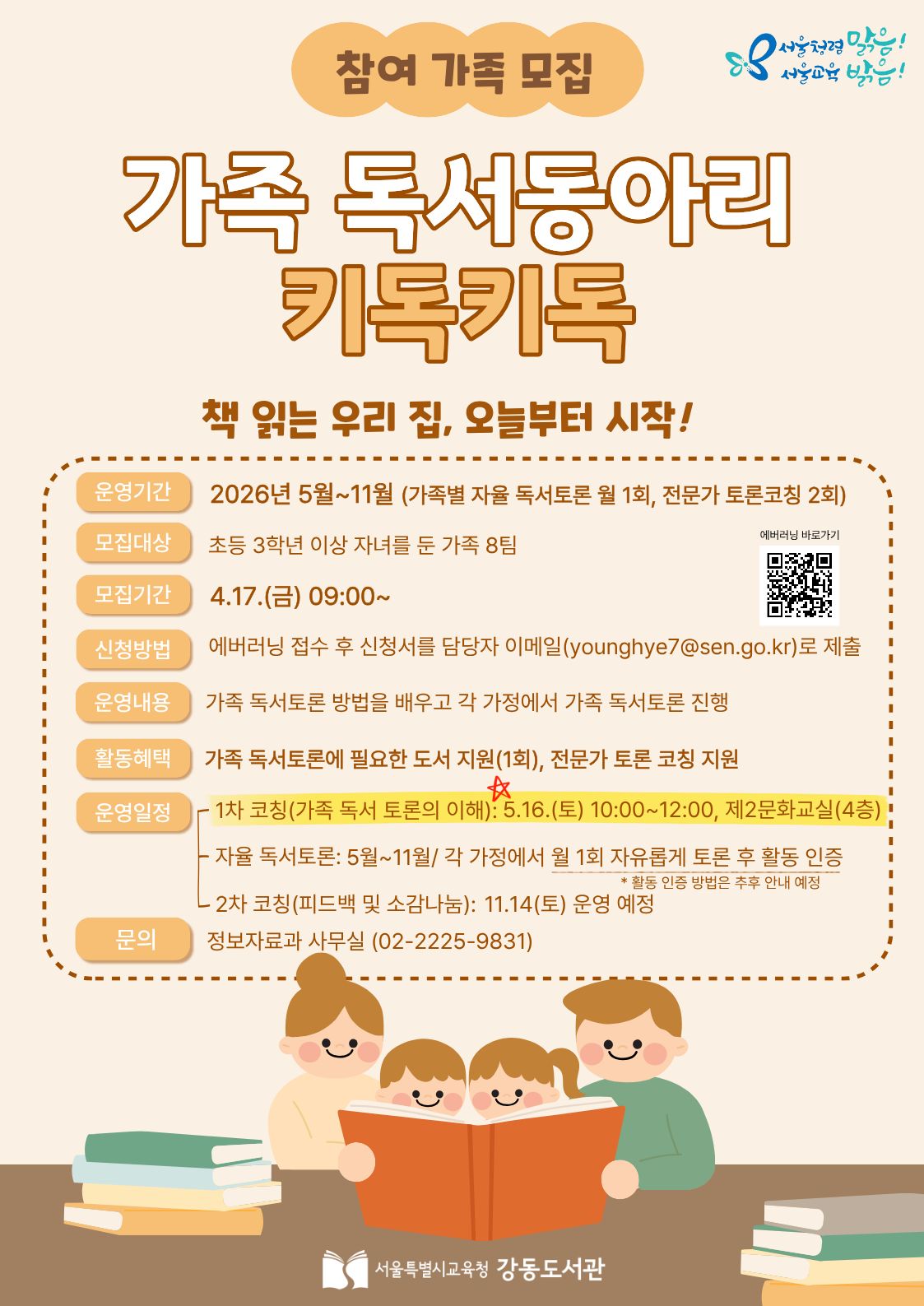 □ 서울특별시교육청(교육감 권한대행 김천홍) 소속 강동도서관(관장 김종미)은 가족 간 독서 경험을 공유하고 세대 간 수평적인 토론 문화를 형성하기 위해 2026년 가족 독서동아리「키독키독」을 운영한다.
