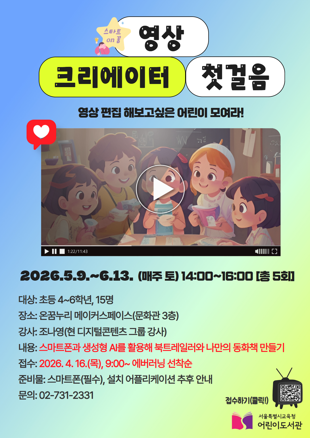 ▢ 『영상 크리에이터 첫걸음』은 초등학교 4~6학년 어린이를 대상으로 5월 9일부터 6월 13일까지 매주 토요일 오후 2시~4시, 총 5회차로 온꿈누리 메이커스페이스에서 진행된다. 1회차는 영상 제작 기초 이해 및 자기소개 영상 제작, 2~3회차는 책을 활용한 북트레일러 기획·촬영·편집, 4회차는 생성형 AI를 활용한 동화책 제작, 5회차는 제작한 콘텐츠를 영상으로 완성하고 상영하는 과정으로 구성된다.
