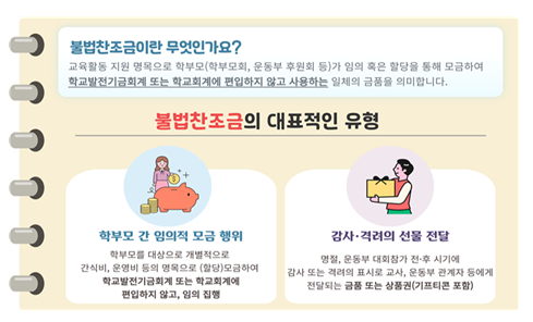 ▢ 불법찬조금이란 교육지원 활동을 명목으로 학교 정식 회계에 편입하지 않고 음성적으로 이를 조성하는 모든 금품을 뜻한다. 예를 들어 학생 간식비 등의 명목으로 학부모 간 할당을 통해 금원을 조성한다던가 명절 등에 감사와 격려의 표시로 운동부 코치나 감독 등에게 금품이나 기프티콘을 전달하는 행위가 이에 해당한다.