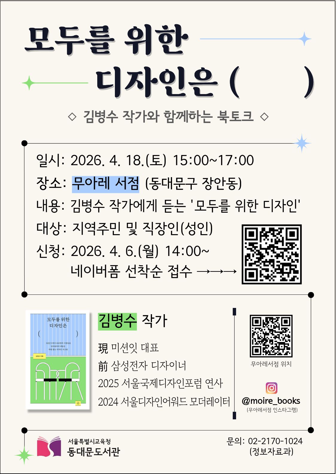 ▢ 서울특별시교육청(교육감 정근식) 산하 동대문도서관(관장 전창신)은 제62회 도서관주간을 맞아 동네책방 '무아레 서점'과 함께 「모두를 위한 디자인은 ( )」 을 운영한다.