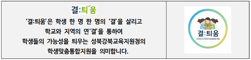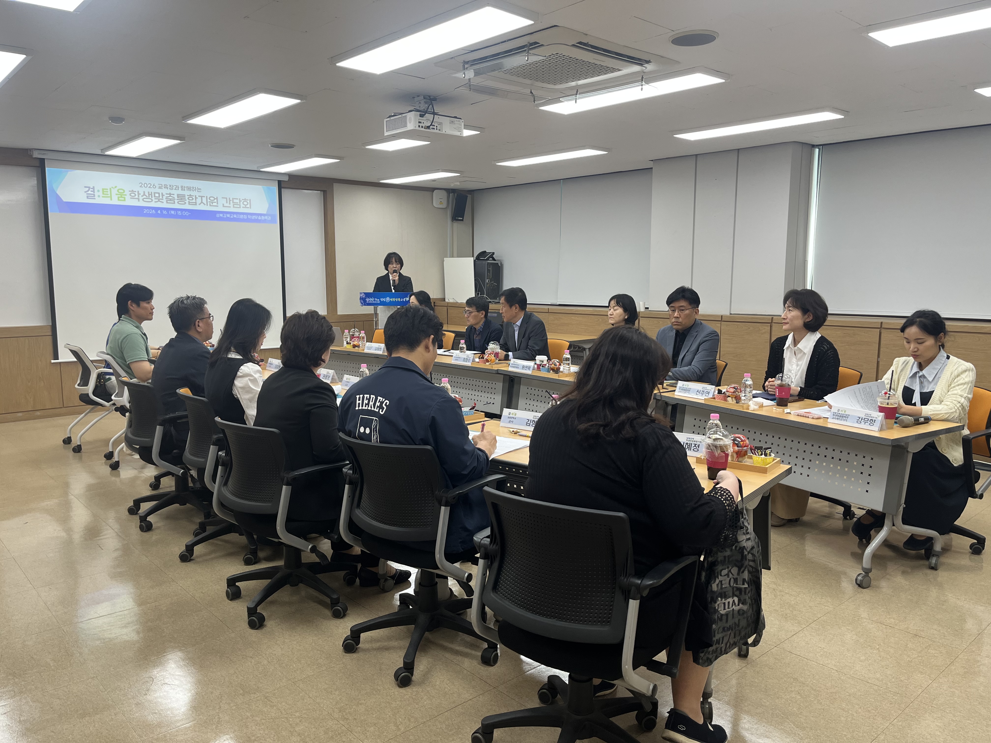 ▢ 서울특별시성북강북교육지원청(교육장 최창수, 이하 성북강북교육지원청)은 2026년 4월 16일(목) '2026 교육장과 함께하는 결:틔움 학생맞춤통합지원 간담회'를 개최하여 학교 현장 교원들과 학생맞춤통합지원 운영 현황을 공유하고 향후 협력 방안을 논의하였다.