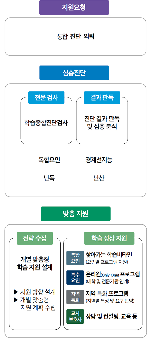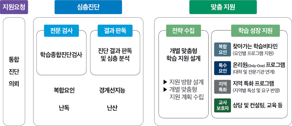 심층진단은 인지·정서·환경 등 복합 요인으로 전문적 지원이 필요한 학생을 위한 체계입니다. 학교 단위 지원을 넘어 정밀 진단을 실시하고, 개별 특성에 맞춘 지원을 제공합니다. 특히 초등학교 1학년에 읽기곤란(난독)이 의심되는 학생을 조기에 발굴해 기초 문해력 형성을 돕습니다. 또한 경계선 지능 학생의 경우, 고등학교 1학년 시기를 중요한 전환기로 보고 학업 적응과 진로 설계를 통합적으로 지원합니다.