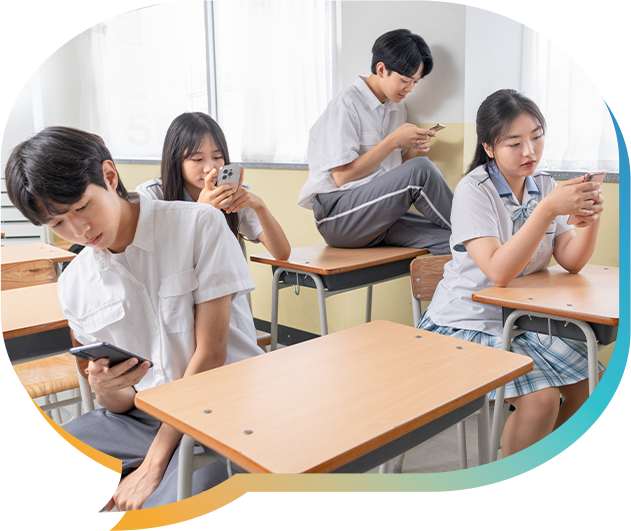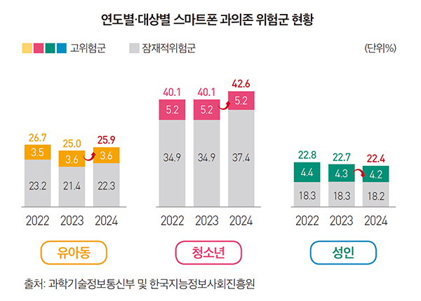 청소년은 다른 연령대에 비해 스마트폰 과의존 위험군 비율이 가장 높은 집단이며 꾸준히 증가하고 있습니다. 과학기술정보통신부와 한국지능정보사회진흥원(NIA)이 발표한 「2024 스마트폰 과의존 실태조사」에 따르면 청소년(만 10~19세)의 과의존 위험군 비율은 2023년 40.1%에서 2024년 42.6%로 상승하였습니다. 이 중 고위험군은 5.2%, 잠재적 위험군은 37.4%로 나타났습니다. 이러한 결과는 스마트폰이 청소년의 일상에 깊이 자리 잡으면서 과도한 이용과 그에 따른 부작용의 가능성도 함께 커지고 있음을 보여줍니다.