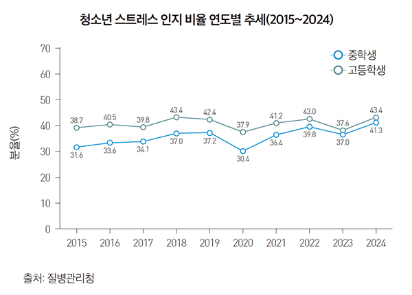 질병관리청 「청소년건강행태조사」 결과에 따르면 스트레스를 많이 느낀다고 응답한 청소년의 비율은 2015년 중학생 31.6%, 고등학생 38.7%에서 최근에는 각각 41.3%와 43.4%로 증가한 것으로 나타났습니다. 학업과 바쁜 일상에서 스트레스를 해소할 시간과 여유가 부족한 청소년들은 이를 스마트폰을 통해 풀고 있는 것으로 보입니다. 한국언론진흥재단의 조사에서도 스마트폰을 통해 얻는 도움 가운데 ‘스트레스 풀기’가 70.6%로 가장 높게 나타나, 청소년들이 스마트폰을 일상의 스트레스 해소 수단으로 활용하고 있음을 보여줍니다. 그러나 스마트폰은 즐거움과 휴식을 제공하는 긍정적인 역할을 하기도 하지만, 사용 시간이 길어지거나 과의존으로 이어질 경우 오히려 스트레스와 정서적 부담을 높이는 요인이 될 수도 있습니다.