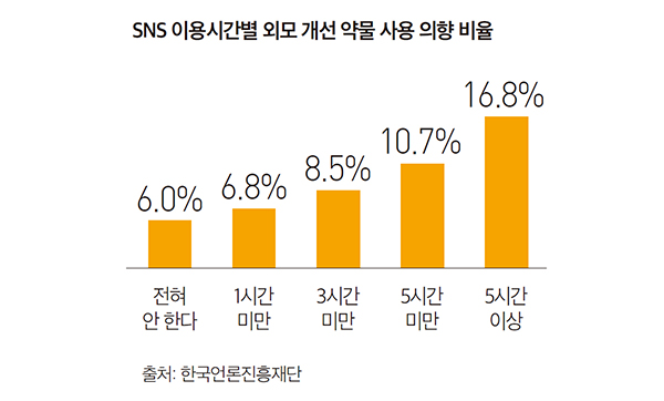 한국청소년정책연구원의 조사 결과, 청소년의 SNS 사용 시간이 길수록 자신의 외모개선을 위해서라면 불법 약물도 사용할 수 있다는 응답 비율이 높아지는 경향이 나타났습니다. SNS를 거의 사용하지 않는 집단에서는 약 6% 수준이었지만, 하루 5시간 이상 사용하는 집단에서는 약 17% 수준으로 나타났습니다. SNS에서 자주 접하게 되는 비현실적인 외모 기준이 비교의 기준이 되면서 자신의 외모에 대한 불만족으로 이어질 수 있습니다(배상률, 2024).